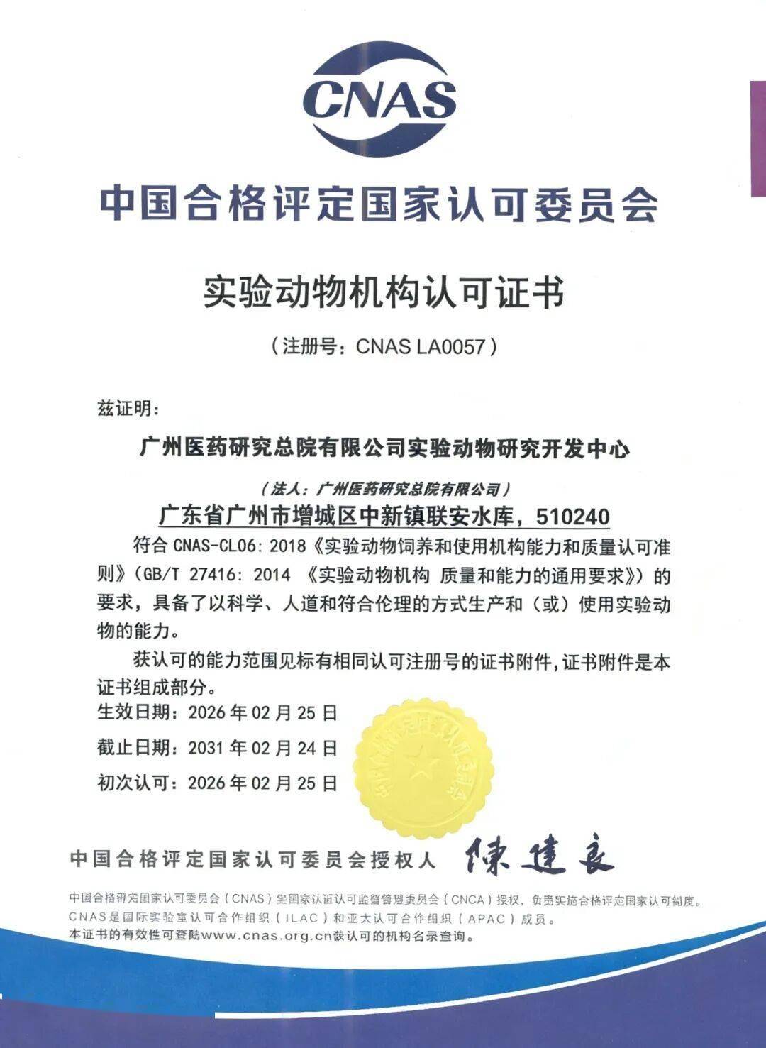 广州医药研究总院实验动物研究开发中心顺利顺利获得CNAS实验动物组织认可